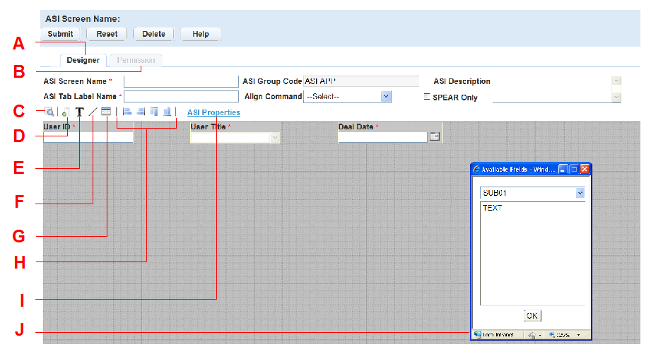 A The Designer tab is where you create and design the form. B The Permission tab is where you assign permissions and make forms available to users. C The Preview button. Click to preview your changes. D The Available Fields button. Click to view the available fields you can add to this page. Double-click the name of the field to add it to the form. E The Add Label button. Click to add text to the page. F The Add Line button. Click to add a line to the page. G The Add Custom Lists or Attributes button. This button is only available in the Custom Fields tool and the Asset Form Layout Editor. Click the button to add the table associated with a Custom Fields Group Code or an Asset Template ID to the form. H The Alignment buttons. Click to align the fields left, right, top, or bottom. I Custom Fields Properties. This link takes you to respective configuration area in Civic Platform. The fields available pertain to the attribute template for the APO Type, the Custom Fields subgroups, or the Workflow subgroups. If you need to add a field to available fields list, you must first add it to the respective area: the attribute template, the Custom Fields subgroups, or the Workflow subgroups. J The Available Fields window. This window displays all available fields for the APO Type, Custom Fields Group Code, Asset Template ID, and TSI Group Code. Double-click the field name to add it to the form. Complete the appropriate fields for the form you are designing. Go to the substep for the screen name you are designing: APO screen name, Custom Fields screen name, Asset screen name, or TSI screen name.