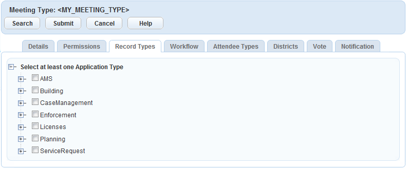 You can associate or disassociate one or more record types with a meeting type. When you schedule a meeting of a particular meeting type, you select instances of the associated record types to be the agenda items for your meeting.