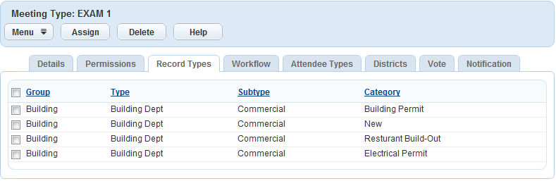 You create a meeting type named Review and associate building records with that meeting type. When you schedule a meeting and designate it as a Review meeting type, you can link building records to the meeting as agenda items.