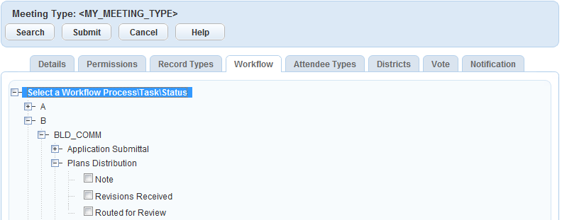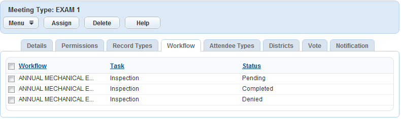 When you set up meeting types, you designate the type and the status group. You must create the meeting type first, then complete the tabs for the meeting type to complete the meeting type definition.