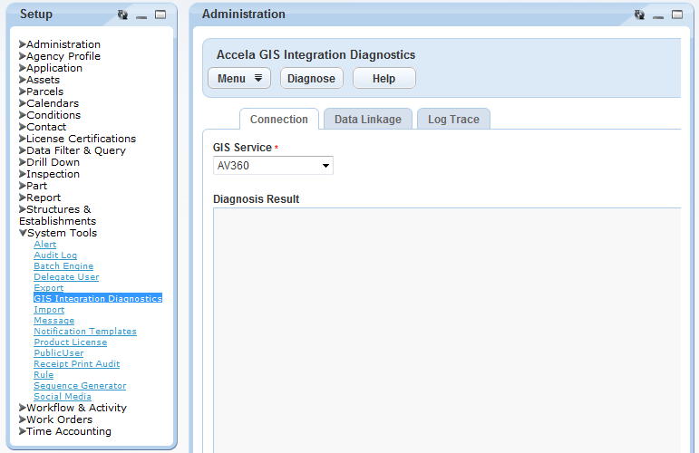 1. Access the Accela GIS Integration Diagnostics Portlet (Accessing the the legacy Accela GIS Integration Diagnostics Portlet).