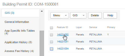 The GIS section shows the selected GIS objects that have been attached to the record. The following sample diagram shows the two selected parcels that are now attached to a record: